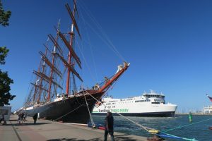 Tied up between fat red fishing boats in the old harbour, it feels snug. NW squalls whistle overhead and the fishermen advise us to sit tight. It is finally sunny though. The towering masts of the Russian sail training ship Sedov provide a majestic backdrop.